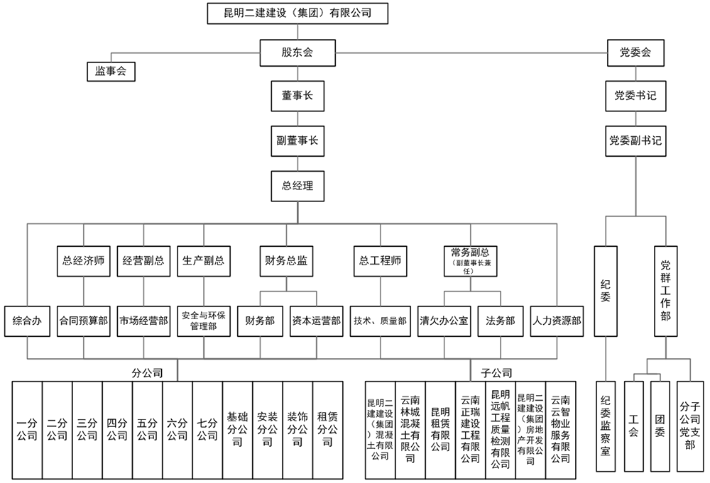 公司設置12個(gè)職能管理部門(mén),分別為綜合辦公室、合同預算部、市場(chǎng)經(jīng)營(yíng)部、財務(wù)部、資本運營(yíng)部、安全環(huán)保部、技術(shù)、質(zhì)量部、清欠辦公室、法務(wù)部、人力資源部、黨群工作部、紀檢監察室;設立11家分公司,分別為一分公司、二分公司、三分公司、四分公司、五分公司、六分公司、七分公司、基礎分公司、裝飾分公司、安裝分公司、租賃分公司共計;下設7家子公司,分別為設立云南正瑞建設工程有限公司、昆明二建建設(集團)混凝土有限公司、云南林城混凝土有限公司、昆明租賃有限公司、昆明二建建設(集團)房地產(chǎn)開(kāi)發(fā)有限公司、昆明遠帆工程質(zhì)量檢測有限公司、云南云智物業(yè)服務(wù)有限公司(其中除云南云智物業(yè)服務(wù)有限公司為參股公司外,其余6家公司均為公司全資子公司)。